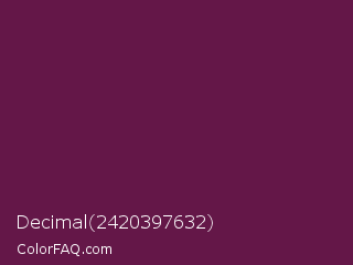 Decimal 2420397632 Color is a dark magenta color and the nearest color is Tawny Port #692545. Hex code #641748 and RGB value is rgb(100,23,72). In RGB color space, this color is composed of 39% red, 9% green, 28% blue, In CMYK color space, this color is composed of 0% cyan, 77% magenta, 28% yellow , 61% black , In HSL color space, this color has a hue angle of 322° , 63% saturation and 24% lightness.