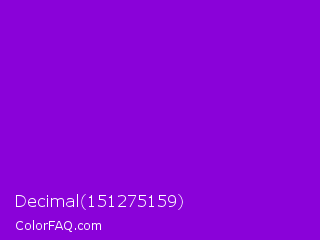 Decimal 151275159 Color is a normal purple color and the nearest color is Dark Violet #9400d3. Hex code #8a02d9 and RGB value is rgb(138,2,217). In RGB color space, this color is composed of 54% red, 1% green, 85% blue, In CMYK color space, this color is composed of 36% cyan, 99% magenta, 0% yellow , 15% black , In HSL color space, this color has a hue angle of 278° , 98% saturation and 43% lightness.