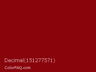 Decimal 151277571 Color is a dark red color and the nearest color is Red Devil #860111. Hex code #8a040b and RGB value is rgb(138,4,11). In RGB color space, this color is composed of 54% red, 2% green, 4% blue, In CMYK color space, this color is composed of 0% cyan, 97% magenta, 92% yellow , 46% black , In HSL color space, this color has a hue angle of 357° , 94% saturation and 28% lightness.