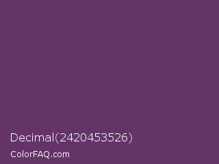 Decimal 2420453526 Color is a normal magenta color and the nearest color is Imperial #602f6b. Hex code #643468 and RGB value is rgb(100,52,104). In RGB color space, this color is composed of 39% red, 20% green, 41% blue, In CMYK color space, this color is composed of 4% cyan, 50% magenta, 0% yellow , 59% black , In HSL color space, this color has a hue angle of 295° , 33% saturation and 31% lightness.