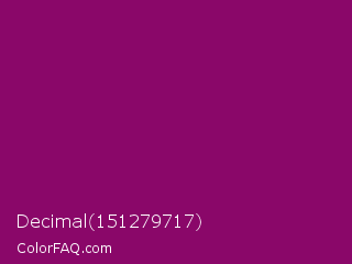 Decimal 151279717 Color is a dark magenta color and the nearest color is Cardinal Pink #8c055e. Hex code #8a0769 and RGB value is rgb(138,7,105). In RGB color space, this color is composed of 54% red, 3% green, 41% blue, In CMYK color space, this color is composed of 0% cyan, 95% magenta, 24% yellow , 46% black , In HSL color space, this color has a hue angle of 315° , 90% saturation and 28% lightness.