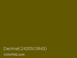 Decimal 2420515943 Color is a very dark yellow color and the nearest color is Antique Bronze #704a07. Hex code #645903 and RGB value is rgb(100,89,3). In RGB color space, this color is composed of 39% red, 35% green, 1% blue, In CMYK color space, this color is composed of 0% cyan, 11% magenta, 97% yellow , 61% black , In HSL color space, this color has a hue angle of 53° , 94% saturation and 20% lightness.
