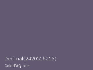 Decimal 2420516216 Color is a normal violet color and the nearest color is Smoky #605b73. Hex code #645972 and RGB value is rgb(100,89,114). In RGB color space, this color is composed of 39% red, 35% green, 45% blue, In CMYK color space, this color is composed of 12% cyan, 22% magenta, 0% yellow , 55% black , In HSL color space, this color has a hue angle of 266° , 12% saturation and 40% lightness.