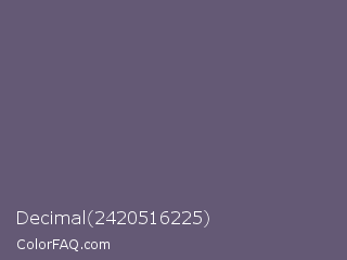 Decimal 2420516225 Color is a normal violet color and the nearest color is Smoky #605b73. Hex code #645975 and RGB value is rgb(100,89,117). In RGB color space, this color is composed of 39% red, 35% green, 46% blue, In CMYK color space, this color is composed of 15% cyan, 24% magenta, 0% yellow , 54% black , In HSL color space, this color has a hue angle of 264° , 14% saturation and 40% lightness.