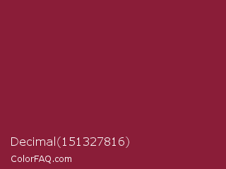 Decimal 151327816 Color is a normal red color and the nearest color is Antique Ruby #841b2d. Hex code #8a1d38 and RGB value is rgb(138,29,56). In RGB color space, this color is composed of 54% red, 11% green, 22% blue, In CMYK color space, this color is composed of 0% cyan, 79% magenta, 59% yellow , 46% black , In HSL color space, this color has a hue angle of 345° , 65% saturation and 33% lightness.