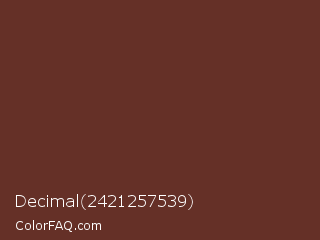 Decimal 2421257539 Color is a dark red color and the nearest color is Buccaneer #622f30. Hex code #653027 and RGB value is rgb(101,48,39). In RGB color space, this color is composed of 40% red, 19% green, 15% blue, In CMYK color space, this color is composed of 0% cyan, 52% magenta, 61% yellow , 60% black , In HSL color space, this color has a hue angle of 9° , 44% saturation and 27% lightness.