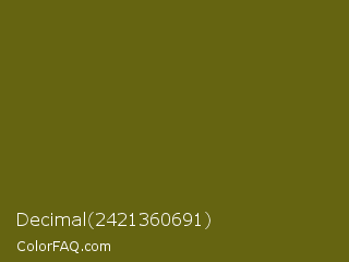 Decimal 2421360691 Color is a dark yellow color and the nearest color is Himalaya #6a5d1b. Hex code #656411 and RGB value is rgb(101,100,17). In RGB color space, this color is composed of 40% red, 39% green, 7% blue, In CMYK color space, this color is composed of 0% cyan, 1% magenta, 83% yellow , 60% black , In HSL color space, this color has a hue angle of 59° , 71% saturation and 23% lightness.
