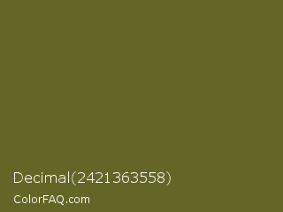 Decimal 2421363558 Color is a dark yellow color and the nearest color is Antique Bronze #665d1e. Hex code #656626 and RGB value is rgb(101,102,38). In RGB color space, this color is composed of 40% red, 40% green, 15% blue, In CMYK color space, this color is composed of 1% cyan, 0% magenta, 63% yellow , 60% black , In HSL color space, this color has a hue angle of 61° , 46% saturation and 27% lightness.