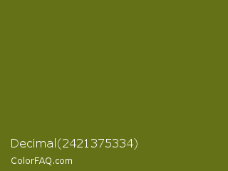 Decimal 2421375334 Color is a dark yellow color and the nearest color is Fern Frond #657220. Hex code #657116 and RGB value is rgb(101,113,22). In RGB color space, this color is composed of 40% red, 44% green, 9% blue, In CMYK color space, this color is composed of 11% cyan, 0% magenta, 81% yellow , 56% black , In HSL color space, this color has a hue angle of 68° , 67% saturation and 26% lightness.