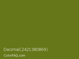 Decimal 2421380869 Color is a dark lime color and the nearest color is Fern Frond #657220. Hex code #657719 and RGB value is rgb(101,119,25). In RGB color space, this color is composed of 40% red, 47% green, 10% blue, In CMYK color space, this color is composed of 15% cyan, 0% magenta, 79% yellow , 53% black , In HSL color space, this color has a hue angle of 71° , 65% saturation and 28% lightness.