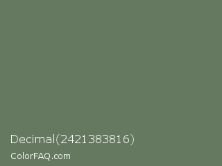 Decimal 2421383816 Color is a normal green color and the nearest color is Willow Grove #65745d. Hex code #657960 and RGB value is rgb(101,121,96). In RGB color space, this color is composed of 40% red, 47% green, 38% blue, In CMYK color space, this color is composed of 17% cyan, 0% magenta, 21% yellow , 53% black , In HSL color space, this color has a hue angle of 108° , 12% saturation and 43% lightness.