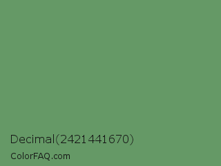 Decimal 2421441670 Color is a normal green color and the nearest color is Russian Green #679267. Hex code #659966 and RGB value is rgb(101,153,102). In RGB color space, this color is composed of 40% red, 60% green, 40% blue, In CMYK color space, this color is composed of 34% cyan, 0% magenta, 33% yellow , 40% black , In HSL color space, this color has a hue angle of 121° , 20% saturation and 50% lightness.