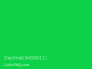 Decimal 9459011 Color is a normal green color and the nearest color is Malachite #0bda51. Hex code #0dd147 and RGB value is rgb(13,209,71). In RGB color space, this color is composed of 5% red, 82% green, 28% blue, In CMYK color space, this color is composed of 94% cyan, 0% magenta, 66% yellow , 18% black , In HSL color space, this color has a hue angle of 138° , 88% saturation and 44% lightness.