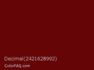 Decimal 2421628992 Color is a very dark red color and the nearest color is Rosewood #65000b. Hex code #660508 and RGB value is rgb(102,5,8). In RGB color space, this color is composed of 40% red, 2% green, 3% blue, In CMYK color space, this color is composed of 0% cyan, 95% magenta, 92% yellow , 60% black , In HSL color space, this color has a hue angle of 358° , 91% saturation and 21% lightness.