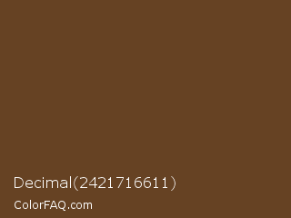 Decimal 2421716611 Color is a dark orange color and the nearest color is Otter Brown #654321. Hex code #664223 and RGB value is rgb(102,66,35). In RGB color space, this color is composed of 40% red, 26% green, 14% blue, In CMYK color space, this color is composed of 0% cyan, 35% magenta, 66% yellow , 60% black , In HSL color space, this color has a hue angle of 28° , 49% saturation and 27% lightness.