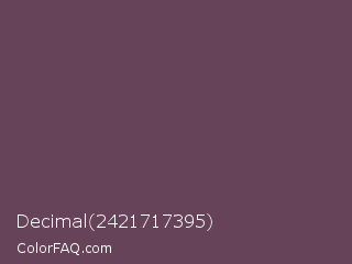 Decimal 2421717395 Color is a normal magenta color and the nearest color is Eggplant #614051. Hex code #664359 and RGB value is rgb(102,67,89). In RGB color space, this color is composed of 40% red, 26% green, 35% blue, In CMYK color space, this color is composed of 0% cyan, 34% magenta, 13% yellow , 60% black , In HSL color space, this color has a hue angle of 322° , 21% saturation and 33% lightness.