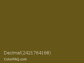 Decimal 2421764168 Color is a dark yellow color and the nearest color is West Coast #625119. Hex code #665718 and RGB value is rgb(102,87,24). In RGB color space, this color is composed of 40% red, 34% green, 9% blue, In CMYK color space, this color is composed of 0% cyan, 15% magenta, 76% yellow , 60% black , In HSL color space, this color has a hue angle of 48° , 62% saturation and 25% lightness.