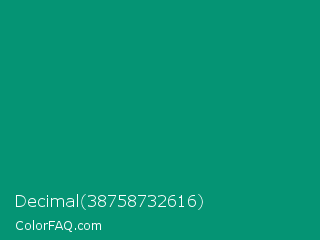 Decimal 38758732616 Color is a dark cyan color and the nearest color is Paolo Veronese Green #009b7d. Hex code #059474 and RGB value is rgb(5,148,116). In RGB color space, this color is composed of 2% red, 58% green, 45% blue, In CMYK color space, this color is composed of 97% cyan, 0% magenta, 22% yellow , 42% black , In HSL color space, this color has a hue angle of 167° , 93% saturation and 30% lightness.