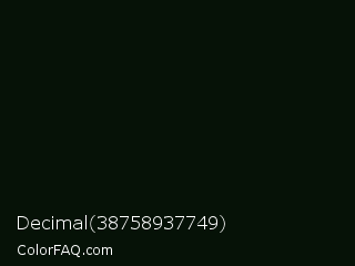 Decimal 38758937749 Color is a almost black green color and the nearest color is Midnight Moss #041004. Hex code #061207 and RGB value is rgb(6,18,7). In RGB color space, this color is composed of 2% red, 7% green, 3% blue, In CMYK color space, this color is composed of 67% cyan, 0% magenta, 61% yellow , 93% black , In HSL color space, this color has a hue angle of 125° , 50% saturation and 5% lightness.