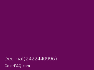 Decimal 2422440996 Color is a very dark magenta color and the nearest color is Pompadour #660045. Hex code #670858 and RGB value is rgb(103,8,88). In RGB color space, this color is composed of 40% red, 3% green, 35% blue, In CMYK color space, this color is composed of 0% cyan, 92% magenta, 15% yellow , 60% black , In HSL color space, this color has a hue angle of 309° , 86% saturation and 22% lightness.