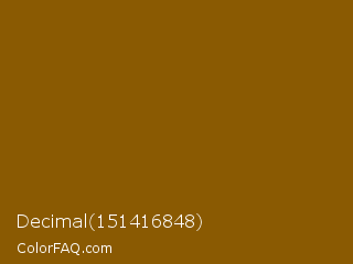 Decimal 151416848 Color is a dark orange color and the nearest color is Rusty Nail #86560a. Hex code #8a5a02 and RGB value is rgb(138,90,2). In RGB color space, this color is composed of 54% red, 35% green, 1% blue, In CMYK color space, this color is composed of 0% cyan, 35% magenta, 99% yellow , 46% black , In HSL color space, this color has a hue angle of 39° , 97% saturation and 27% lightness.