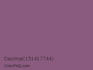 Decimal 151417744 Color is a normal magenta color and the nearest color is Antique Fuchsia #915c83. Hex code #8a5b7e and RGB value is rgb(138,91,126). In RGB color space, this color is composed of 54% red, 36% green, 49% blue, In CMYK color space, this color is composed of 0% cyan, 34% magenta, 9% yellow , 46% black , In HSL color space, this color has a hue angle of 315° , 21% saturation and 45% lightness.