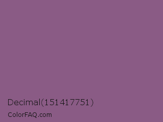 Decimal 151417751 Color is a normal magenta color and the nearest color is Antique Fuchsia #915c83. Hex code #8a5b85 and RGB value is rgb(138,91,133). In RGB color space, this color is composed of 54% red, 36% green, 52% blue, In CMYK color space, this color is composed of 0% cyan, 34% magenta, 4% yellow , 46% black , In HSL color space, this color has a hue angle of 306° , 21% saturation and 45% lightness.