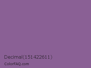 Decimal 151422611 Color is a normal purple color and the nearest color is Trendy Pink #8c6495. Hex code #8a6095 and RGB value is rgb(138,96,149). In RGB color space, this color is composed of 54% red, 38% green, 58% blue, In CMYK color space, this color is composed of 7% cyan, 36% magenta, 0% yellow , 42% black , In HSL color space, this color has a hue angle of 288° , 22% saturation and 48% lightness.