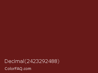 Decimal 2423292488 Color is a dark red color and the nearest color is Cherrywood #651a14. Hex code #681918 and RGB value is rgb(104,25,24). In RGB color space, this color is composed of 41% red, 10% green, 9% blue, In CMYK color space, this color is composed of 0% cyan, 76% magenta, 77% yellow , 59% black , In HSL color space, this color has a hue angle of 1° , 63% saturation and 25% lightness.