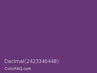 Decimal 2423346448 Color is a normal purple color and the nearest color is Eminence #6c3082. Hex code #683576 and RGB value is rgb(104,53,118). In RGB color space, this color is composed of 41% red, 21% green, 46% blue, In CMYK color space, this color is composed of 12% cyan, 55% magenta, 0% yellow , 54% black , In HSL color space, this color has a hue angle of 287° , 38% saturation and 34% lightness.
