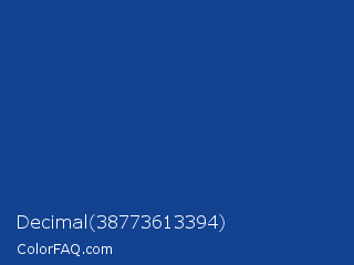 Decimal 38773613394 Color is a normal blue color and the nearest color is Yale Blue #0f4d92. Hex code #124290 and RGB value is rgb(18,66,144). In RGB color space, this color is composed of 7% red, 26% green, 56% blue, In CMYK color space, this color is composed of 88% cyan, 54% magenta, 0% yellow , 44% black , In HSL color space, this color has a hue angle of 217° , 78% saturation and 32% lightness.