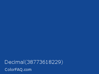 Decimal 38773618229 Color is a normal blue color and the nearest color is Yale Blue #0f4d92. Hex code #124793 and RGB value is rgb(18,71,147). In RGB color space, this color is composed of 7% red, 28% green, 58% blue, In CMYK color space, this color is composed of 88% cyan, 52% magenta, 0% yellow , 42% black , In HSL color space, this color has a hue angle of 215° , 78% saturation and 32% lightness.