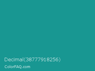 Decimal 38777918256 Color is a normal cyan color and the nearest color is Blue Chill #0c8990. Hex code #189792 and RGB value is rgb(24,151,146). In RGB color space, this color is composed of 9% red, 59% green, 57% blue, In CMYK color space, this color is composed of 84% cyan, 0% magenta, 3% yellow , 41% black , In HSL color space, this color has a hue angle of 178° , 73% saturation and 34% lightness.