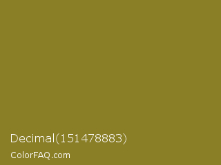 Decimal 151478883 Color is a normal yellow color and the nearest color is Old Moss Green #867e36. Hex code #8a7e27 and RGB value is rgb(138,126,39). In RGB color space, this color is composed of 54% red, 49% green, 15% blue, In CMYK color space, this color is composed of 0% cyan, 9% magenta, 72% yellow , 46% black , In HSL color space, this color has a hue angle of 53° , 56% saturation and 35% lightness.