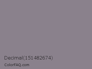 Decimal 151482674 Color is a normal purple color and the nearest color is Monsoon #8a8389. Hex code #8a818c and RGB value is rgb(138,129,140). In RGB color space, this color is composed of 54% red, 51% green, 55% blue, In CMYK color space, this color is composed of 1% cyan, 8% magenta, 0% yellow , 45% black , In HSL color space, this color has a hue angle of 289° , 5% saturation and 53% lightness.