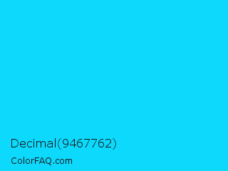 Decimal 9467762 Color is a normal cyan color and the nearest color is Vivid Sky Blue #00ccff. Hex code #0dd9fc and RGB value is rgb(13,217,252). In RGB color space, this color is composed of 5% red, 85% green, 99% blue, In CMYK color space, this color is composed of 95% cyan, 14% magenta, 0% yellow , 1% black , In HSL color space, this color has a hue angle of 189° , 98% saturation and 52% lightness.
