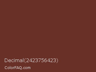 Decimal 2423756423 Color is a dark red color and the nearest color is Liver Organ #6c2e1f. Hex code #693027 and RGB value is rgb(105,48,39). In RGB color space, this color is composed of 41% red, 19% green, 15% blue, In CMYK color space, this color is composed of 0% cyan, 54% magenta, 63% yellow , 59% black , In HSL color space, this color has a hue angle of 8° , 46% saturation and 28% lightness.