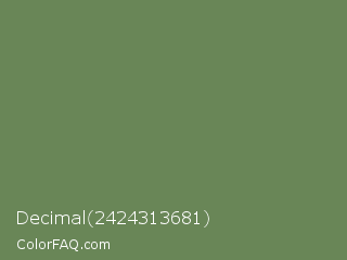 Decimal 2424313681 Color is a normal green color and the nearest color is Glade Green #61845f. Hex code #698657 and RGB value is rgb(105,134,87). In RGB color space, this color is composed of 41% red, 53% green, 34% blue, In CMYK color space, this color is composed of 22% cyan, 0% magenta, 35% yellow , 47% black , In HSL color space, this color has a hue angle of 97° , 21% saturation and 43% lightness.