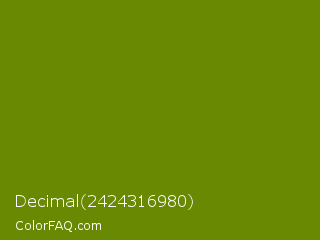 Decimal 2424316980 Color is a dark lime color and the nearest color is Avocado #568203. Hex code #698902 and RGB value is rgb(105,137,2). In RGB color space, this color is composed of 41% red, 54% green, 1% blue, In CMYK color space, this color is composed of 23% cyan, 0% magenta, 99% yellow , 46% black , In HSL color space, this color has a hue angle of 74° , 97% saturation and 27% lightness.