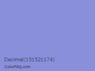 Decimal 151521174 Color is a light blue color and the nearest color is Chetwode Blue #8581d9. Hex code #8a8fdc and RGB value is rgb(138,143,220). In RGB color space, this color is composed of 54% red, 56% green, 86% blue, In CMYK color space, this color is composed of 37% cyan, 35% magenta, 0% yellow , 14% black , In HSL color space, this color has a hue angle of 236° , 54% saturation and 70% lightness.
