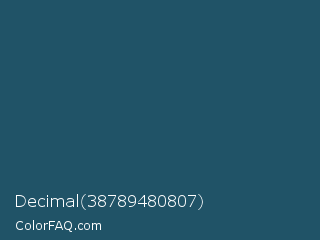 Decimal 38789480807 Color is a dark blue color and the nearest color is San Juan #304b6a. Hex code #205367 and RGB value is rgb(32,83,103). In RGB color space, this color is composed of 13% red, 33% green, 40% blue, In CMYK color space, this color is composed of 69% cyan, 19% magenta, 0% yellow , 60% black , In HSL color space, this color has a hue angle of 197° , 53% saturation and 26% lightness.