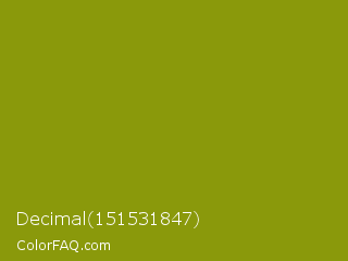 Decimal 151531847 Color is a normal yellow color and the nearest color is Dark Yellow #9b870c. Hex code #8a990b and RGB value is rgb(138,153,11). In RGB color space, this color is composed of 54% red, 60% green, 4% blue, In CMYK color space, this color is composed of 10% cyan, 0% magenta, 93% yellow , 40% black , In HSL color space, this color has a hue angle of 66° , 87% saturation and 32% lightness.