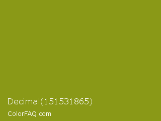 Decimal 151531865 Color is a normal yellow color and the nearest color is Trendy Green #7c881a. Hex code #8a9917 and RGB value is rgb(138,153,23). In RGB color space, this color is composed of 54% red, 60% green, 9% blue, In CMYK color space, this color is composed of 10% cyan, 0% magenta, 85% yellow , 40% black , In HSL color space, this color has a hue angle of 67° , 74% saturation and 35% lightness.