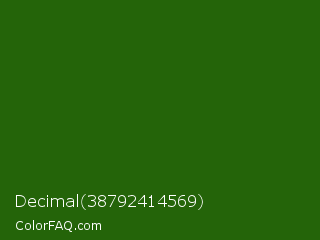Decimal 38792414569 Color is a very dark green color and the nearest color is Lincoln Green #195905. Hex code #246409 and RGB value is rgb(36,100,9). In RGB color space, this color is composed of 14% red, 39% green, 4% blue, In CMYK color space, this color is composed of 64% cyan, 0% magenta, 91% yellow , 61% black , In HSL color space, this color has a hue angle of 102° , 83% saturation and 21% lightness.