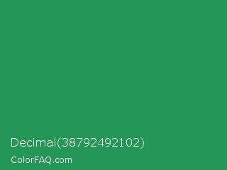 Decimal 38792492102 Color is a normal green color and the nearest color is Eucalyptus #278a5b. Hex code #249656 and RGB value is rgb(36,150,86). In RGB color space, this color is composed of 14% red, 59% green, 34% blue, In CMYK color space, this color is composed of 76% cyan, 0% magenta, 43% yellow , 41% black , In HSL color space, this color has a hue angle of 146° , 61% saturation and 36% lightness.