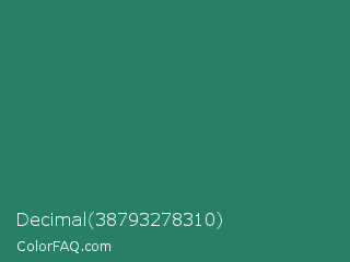 Decimal 38793278310 Color is a normal green color and the nearest color is Eucalyptus #278a5b. Hex code #258066 and RGB value is rgb(37,128,102). In RGB color space, this color is composed of 15% red, 50% green, 40% blue, In CMYK color space, this color is composed of 71% cyan, 0% magenta, 20% yellow , 50% black , In HSL color space, this color has a hue angle of 163° , 55% saturation and 32% lightness.