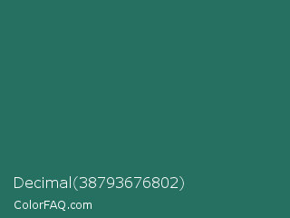 Decimal 38793676802 Color is a dark cyan color and the nearest color is Casal #2f6168. Hex code #267062 and RGB value is rgb(38,112,98). In RGB color space, this color is composed of 15% red, 44% green, 38% blue, In CMYK color space, this color is composed of 66% cyan, 0% magenta, 13% yellow , 56% black , In HSL color space, this color has a hue angle of 169° , 49% saturation and 29% lightness.