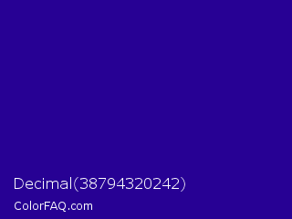 Decimal 38794320242 Color is a dark indigo color and the nearest color is Blue Gem #2c0e8c. Hex code #270194 and RGB value is rgb(39,1,148). In RGB color space, this color is composed of 15% red, 0% green, 58% blue, In CMYK color space, this color is composed of 74% cyan, 99% magenta, 0% yellow , 42% black , In HSL color space, this color has a hue angle of 256° , 99% saturation and 29% lightness.