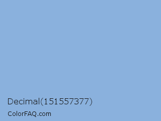 Decimal 151557377 Color is a light blue color and the nearest color is Light Cobalt Blue #88ace0. Hex code #8ab1dd and RGB value is rgb(138,177,221). In RGB color space, this color is composed of 54% red, 69% green, 87% blue, In CMYK color space, this color is composed of 38% cyan, 20% magenta, 0% yellow , 13% black , In HSL color space, this color has a hue angle of 212° , 55% saturation and 70% lightness.