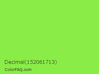 Decimal 152061713 Color is a normal green color and the nearest color is Kiwi #8ee53f. Hex code #8aed47 and RGB value is rgb(138,237,71). In RGB color space, this color is composed of 54% red, 93% green, 28% blue, In CMYK color space, this color is composed of 42% cyan, 0% magenta, 70% yellow , 7% black , In HSL color space, this color has a hue angle of 96° , 82% saturation and 60% lightness.